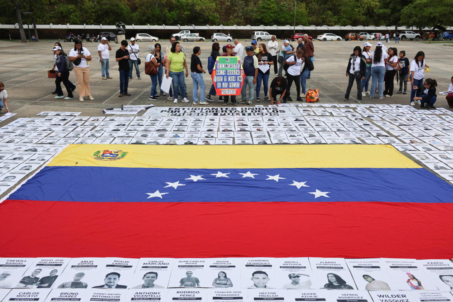 Los manifestantes desplegaron pancartas con fotografías de algunos de los más de 900 presos políticos que continúan encerrados en los centros de detención y tortura del régimen chavista.
