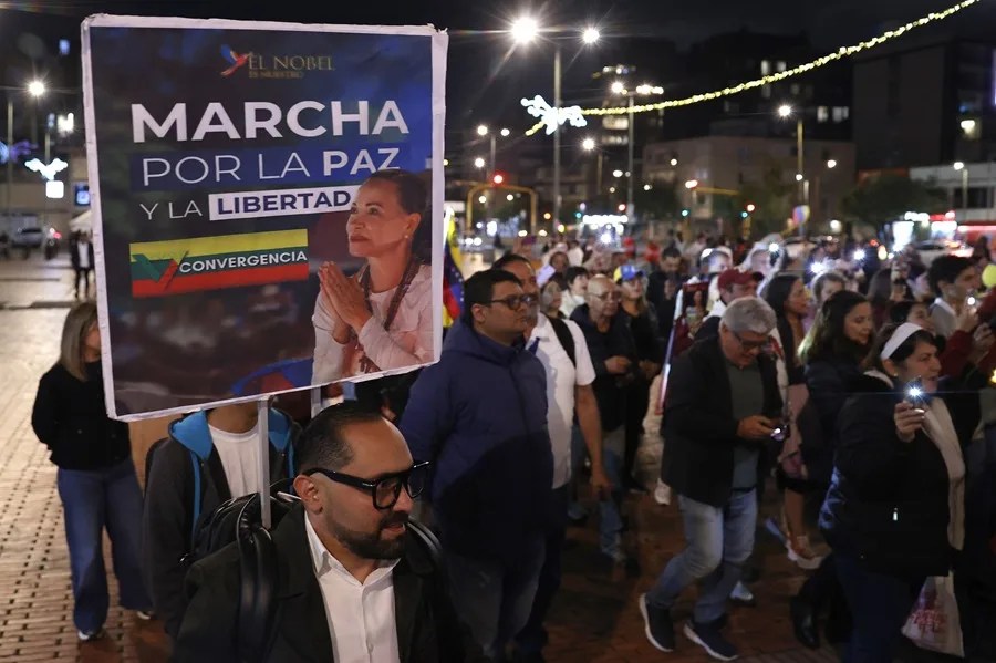 En Bogotá, la manifestación de apoyo responde al llamado que hizo Machado el jueves pasado a los venezolanos en el mundo a marchar «por la paz y la libertad», justo cuatro días antes de la entrega, en Noruega, del Nobel de la Paz 2025, concedido a la exdiputada opositora.