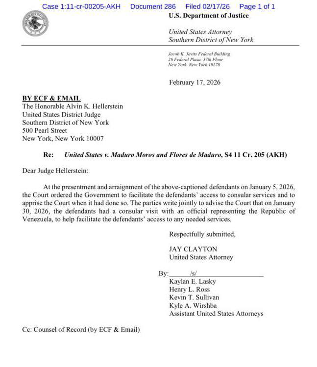 El juez Alvin Hellerstein, encargado del caso de Nicolás Maduro y de su esposa, Cilia Flores, informó el pasado 17 de febrero que ambos enjuiciados recibieron visita consular el pasado 30 de enero, tal como se solicitó el 5 de enero, día en que compareció ante el juez en Nueva York.