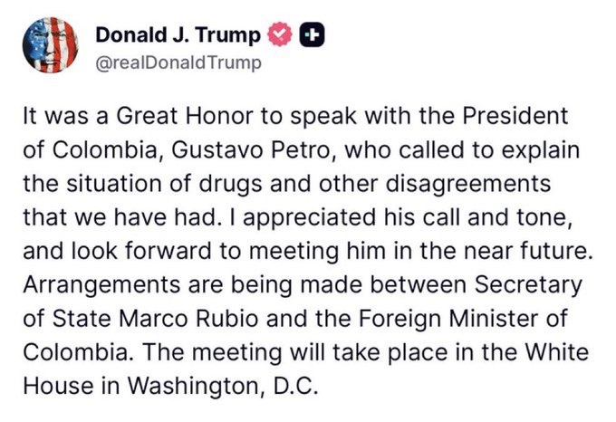 “Agradecí su llamada y su tono, y espero reunirme con él próximamente. El secretario de Estado, Marco Rubio, y el ministro de Relaciones Exteriores de Colombia están realizando los arreglos necesarios. La reunión tendrá lugar en la Casa Blanca, en Washington, D. C.”, agregó.